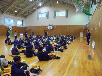 全校集会では、2学期にがんばったみなさんの表彰や、先生方からのお話がありました。