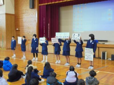児童会タイムでは、保健給食委員会、環境委員会、体育委員会からのお知らせがありました。月テーマを受けて、掃除や手洗い、縄跳び運動など、児童会ではどんなことに取り組んでいくか発表しました。