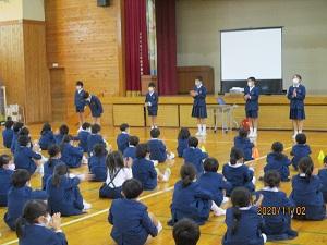 画面を見ながらですが、歌と手話を同時にするのは、かなり難しいことです。でもそこは、6年生のお姉さんにわかりやすく1つ1つの手話を習いながら、とっても上手にできるようになってきました。みんなの心が1つになるすてきな手話ソングです。学期末に予定しているクリスマス会でも披露してくれるそうです。楽しみですね