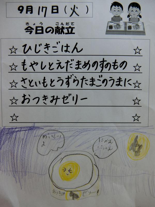 9月17日(火)~20日(金)の献立 投稿日時 : 2024/09/16 agatae 最近月がとってもきれいに輝いていますよね。今年の『中秋の名月』は17日(火)だそうです。この日の給食は,『お月見献立』になっていて,お月見ゼリーがあります! 今週は,20日(金)にもゼリーが出ます!毎日暑いので,食欲も落ち気味ですが,ゼリーはとても食べやすくて,この季節にはありがたいです。1週間に2回もゼリーがあって,みんな大喜びでしょうね!