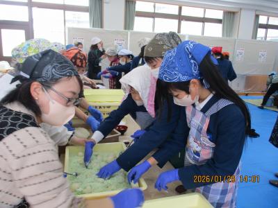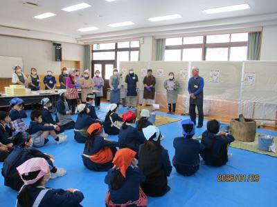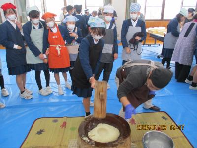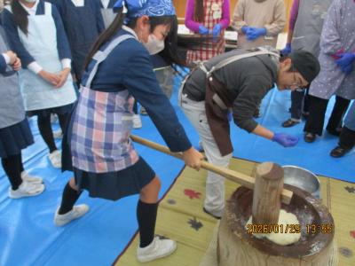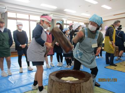 6年生 地域の方ともちつき交流会 投稿日時 : 02/05 agatae 1月29日(木)に、英田地区くらし安心ネットワークの皆様のご協力により、6年生がもちつき交流会に参加させていただきました。 当日は大雪が心配される中でしたが、たくさんの地域の皆さんが来て、子供たちに杵や臼の使い方、餅のつき方を教えてくださいました。 始めは戸惑っていた子供たちでしたが、地域の方の声かけもあり、段々と上達してとても楽しそうでした。 数日前からもち米の準備をしてくださり、雪の中、杵や臼も運んでくださった皆様のおかげです。 本当にありがとうございました。