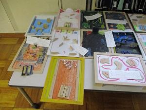 2年生。国語の時間に書いた作品がテーブルにたくさん並んでいました。