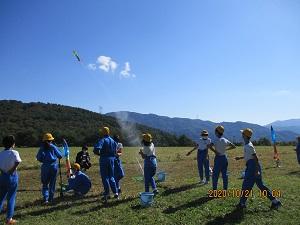 遠くには、白く雪をかぶった白山も見えました。そんな青空に向かって、まずはペットボトルロケットを飛ばしました。
