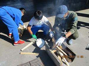 その後、みんなで昼食に食べるカレーを作りました。かまどでの火の起こし方、ご飯の炊き方、カレー作りの手順を聞き、グループに分かれてカレー作りのスタートです。