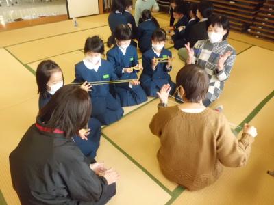 子どもたちは,おじいちゃんおばあちゃんがたと一緒にあやとりやけん玉,竹とんぼなどの昔遊びをし,とても楽しそうでした。昔遊びが上手になるコツもたくさん教えてもらいました。