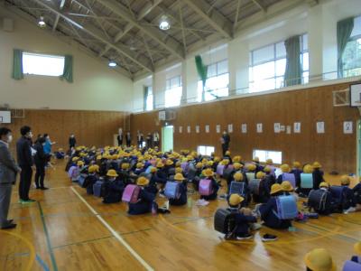 これから迎える冬に向け、悪天候や積雪等で通学路が歩行しにくくなることを想定し、集団下校訓練を行いました。またこの日学校安全委員会を開催し、委員のみなさんにも訓練の様子を見ていただきました。