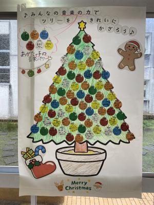 児童玄関に音楽の時間で頑張ったことを飾りにした「音楽のツリー」が飾ってあります。みんなの音楽の力が合わさって、とてもきれいなツリーになりました。
