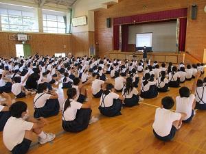 コロナウィルス感染防止や熱中症対応で、今まではずっと学校放送で集会をしていましたが、今日は全校が体育館に集まって、学校集会をしました。1年生にとっては、はじめての学校集会でした。
