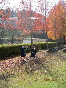 11月とはいえ、本当に暖かな一日でした。こんな秋の日を「小春日和」というのですね。あがたっ子は元気に運動場に出て、体を動かしています。学校のモミジバフウも葉を落とし始め、子どもたちは落ち葉遊びに夢中です。