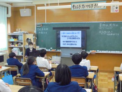たばこやお酒(アルコール)は子どもの成長期には大人以上に悪い影響を及ぼすことや,シンナーや覚せい剤などの危険薬物が脳や体に及ぼす影響について教えていただきました。特に危険薬物は一度でも使用してしまうと依存度がとても高く,脳が縮んだり幻覚や幻聴を起こしたりと大変危険なものであるいうことを教わりました。