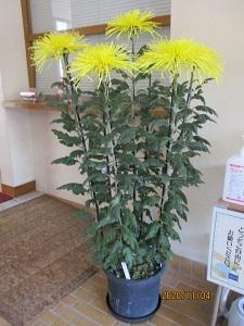 鉢に入った菊は、先日 英田公民館の文化祭に出品された菊花展に参加された方のご厚意で、学校に飾らせていただいているものです。玄関と校長室に置かせていただきました。