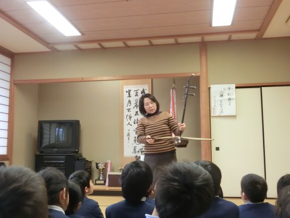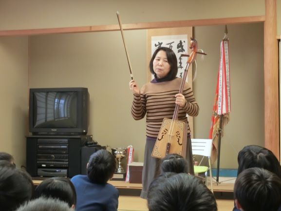 二胡演奏会 投稿日時 : 2019/03/06 agatae 3月4日(月)に李彩霞さんによるお話しと演奏会がありました。国語で「スーホの白い馬」を学習した2年生が参加しました。教科書に出てくる馬頭琴の実際の楽器を見ることができ、とても嬉しそうにしていました。また、美しい二胡の演奏に皆が聴き入っていました。普段なかなか聴くことのできない楽器の演奏を聴くことができ、大変良い機会となりました。 Tweet