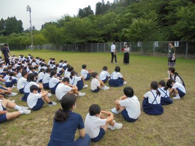 一次避難では各学年ごとに避難し人数の確認を、二次避難では登校班ごとに別れ集団下校ができる体制までを行いました。今日は暑い日となりましたが、子どもたちは真剣に訓練に取り組むことができました。