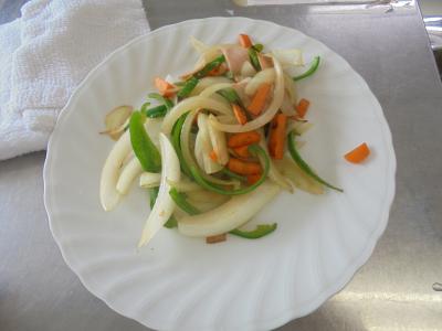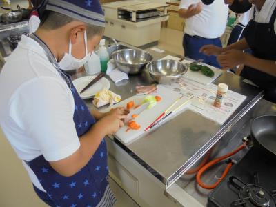 6年 調理実習 投稿日時 : 2023/06/09 agatae 家庭科の学習で調理実習を行いました。メニューは「いろどり(野菜)いため」です。 にんじん,ピーマン,たまねぎ,ハムなど食材に合わせ切っていきます。食材が切れたら,火が通りにくいものから順番を考えて炒めていきます。味付けは塩コショー。調理室には美味しいにおいがただよっていました。 どの子も上手に調理ができていたようです。先日の野外炊飯での経験を生かすことができていますね。 Tweet