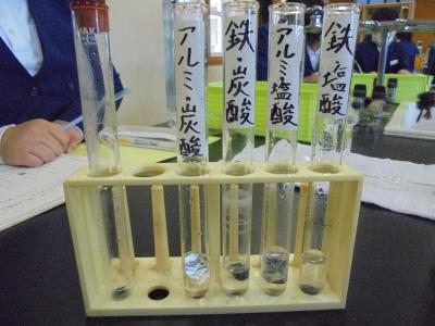 今日は、試験管に入れた鉄(スチールウール)とアルミ(アルミホイル)に、塩酸、炭酸水を注ぎ、金属はどうなるか実験しました。