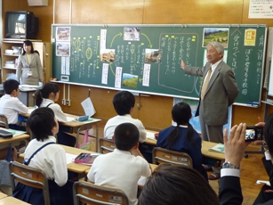 研究授業は5年2組で行いました。「ぼくが愛する千枚田」を資料に、<受け継ぐとは、どういうことだろう>という課題で、郷土愛について考えました。授業の終末には、ゲストティチャーの能瀬川観桜会、会長の板坂様にお話をしていただきました。板坂様のお話から、大変なことがいくつもあるけど、なぜ桜祭りを続けているのか、地域に対する熱い思いをお聞きすることができました。