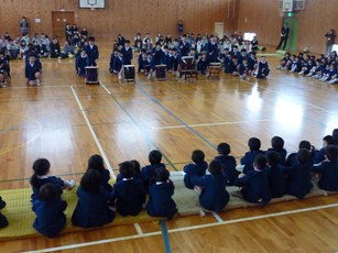 よろしくね集会(1年生を迎える会) 6年生の英田っ子祭り太鼓