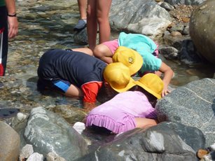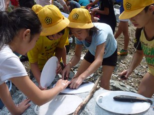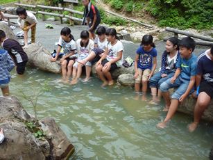 岩魚つかみでは、手づかみした岩魚を自分でさばき、塩焼きにしていただきました。前の学校が取り逃がした岩魚までつかまえており、協力してつかまえたりさばいたり姿が見られました。