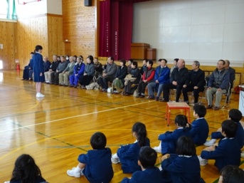 12月8日(月)、防犯ボランティアや図書ボランティアの皆様、ゲストティーチャーの皆様、能瀬駐在所の中山様をお迎えし、ありがとう集会を行いました。