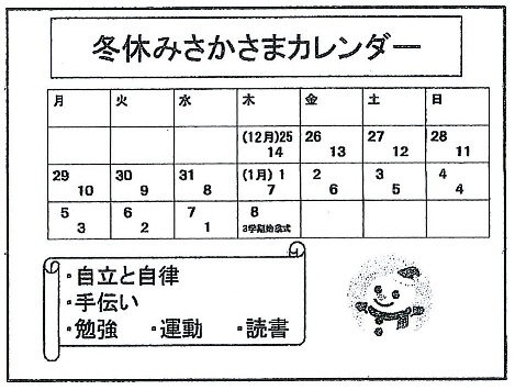 冬休みの14日間は、自分のことは自分でする「自立」と、自分で決めたことはきちんとする「自律」の心で、手伝い、勉強、運動、読書をしっかり頑張ろうということです。