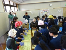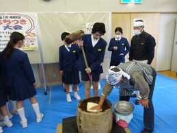 6年生 総合「もちつき大会」 投稿日時 : 2017/01/31 agatae 6年生が総合の時間に地域のお年寄りの方々と一緒にもちつきをしました。子どもたちは、お年寄りに教えてもらいながら楽しそうにもちをついていました。また、地域のお年寄りの方々とお話をしながら食べたつきたてのもちは特別においしい、と嬉しそうに話していました。子どもたちは、なかなかできない貴重な経験ができたと大変喜んでいました。
