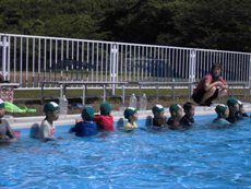 まず、長袖、長ズボン、くつを着用してプールに入り、水の中で衣服を身に付けたまま歩く、走る、泳ぐなどをしてみました。服を着て水の中で動くことが大変なことだということを体感していました。