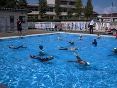 次に、2リットルのペットボトルを使って浮いてみました。これらの体験を通して万が一の時には「泳がない」「騒がない」「浮く」の3つのポイントが大切であることを理解しました。子どもたちは、自分で自分の命を守るというこを着衣泳を通して学ぶことができました。