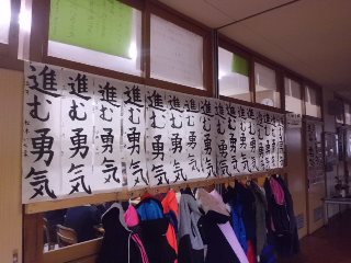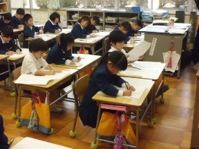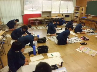 書き初め大会 投稿日時 : 2018/01/09 agatae 1月9日、始業式後の3時間目に書き初め大会がありました。児童は、冬休みに練習した成果を出そうと一画一画を大切に筆を進めていました。1、2年生は硬筆で1年生は「お正月」、2年生は「はつ日の出」を書きました。3~6年生は毛筆で3年生は「美しい心」、4年生は「流れる星」、5年生は「進む勇気」、6年生は「新たな決意」という字を集中して書きました。どの子も立派な清書になりました。
