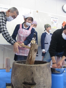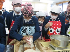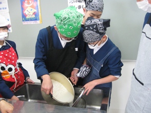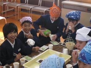 6年生 地域の方々と「もちつき」 投稿日時 : 2018/01/30 agatae 1月30日に6年生が地域の方々ともちつきをしました。前日には、子どもたちは、地域のお菓子屋さんにもち米のとぎかたを教えてもらい、8臼分のもち米を準備しました。当日は、蒸したもち米を地域の方に教えてもらいながら、杵と臼でつきました。実際に餅をついたことのない児童も多く、声をかけ合いながら楽しそうに餅をつくことができました。つきたてのお餅は、きなことあんこ、だいこんおろしで味をつけて、楽しくお話をしながら食べました。色んなお話をしながら活動することができ、地域の方々と和やかな時間を過ごすことができました。