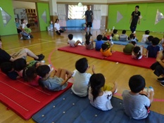 「みんなで力を合わせて楽しむ」というめあてのもと、じゃんけん列車をしたり、マット運動をしたりしました。子どもたちは、しっかりと先生の話を聴いて楽しく活動することができました。