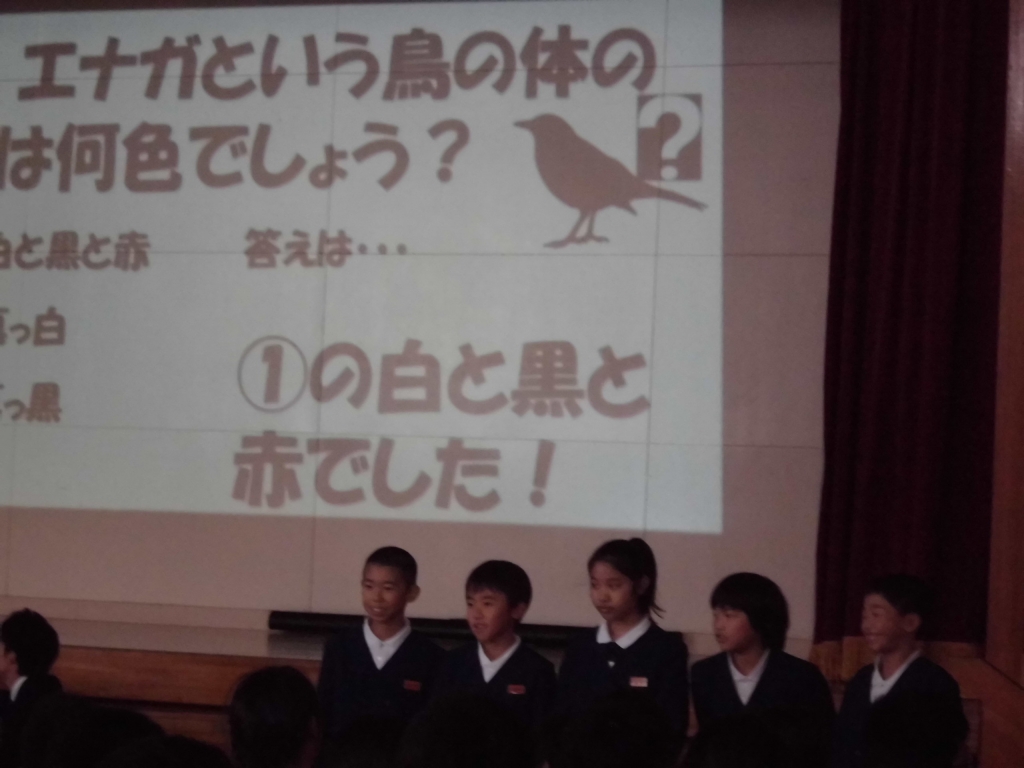 感想コーナーでは、「太鼓の音が身体にも心にも響いてきました。」「色々な音色の太鼓が聴けました。」「太鼓の演奏を聴いていると楽しい気分になりました。」という感想を発表していました。和太鼓演奏が児童の心にも身体にも響いたようでした。