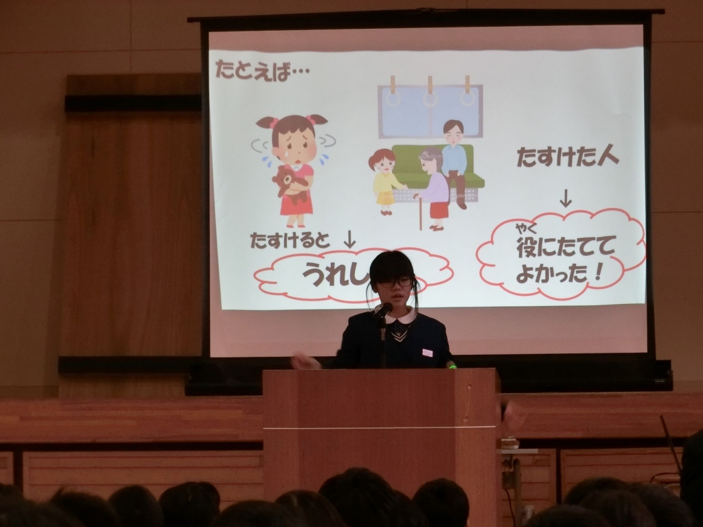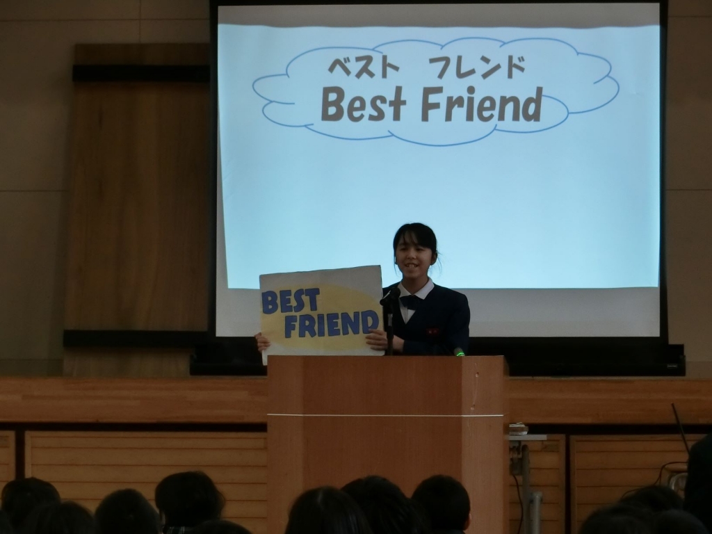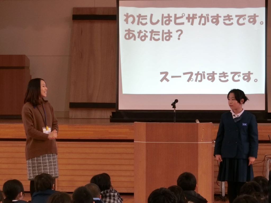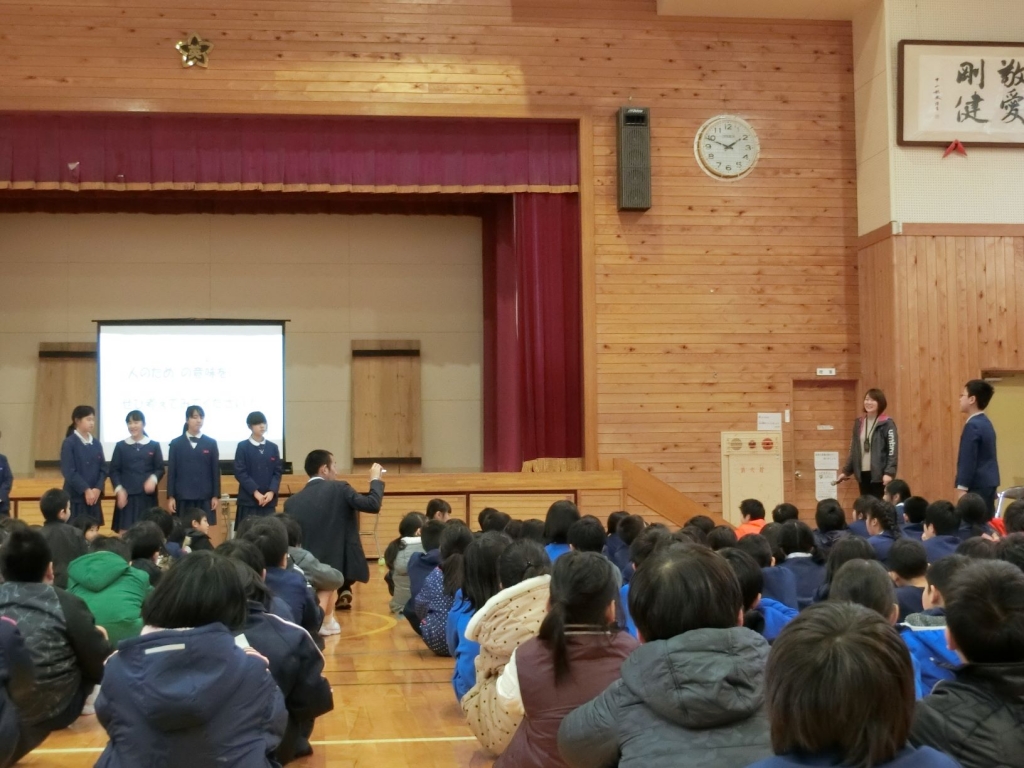 英語スピーチコンテスト 校内発表会 投稿日時 : 2019/01/17 agatae 1月19日(土)に行われる英語スピーチコンテストの校内発表会がありました。コンテストに出場する児童は、全校の前でジェスチャーも交えながら堂々とスピーチをしていました。今までたくさんの練習をしてきた成果がよく出ていました。見ていた児童に感想を聴くと、「たくさんの英語を言っていてびっくりしました」「動きを入れながら英語を話していてすごいと思いました」「今までたくさん練習をしてきたんだなと思いました」と話していました。最後に応援の気持ちを込めて全校みんなで大きな拍手で激励をしました。