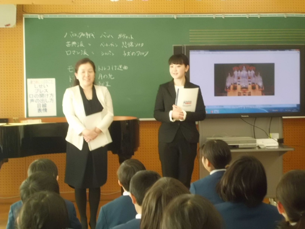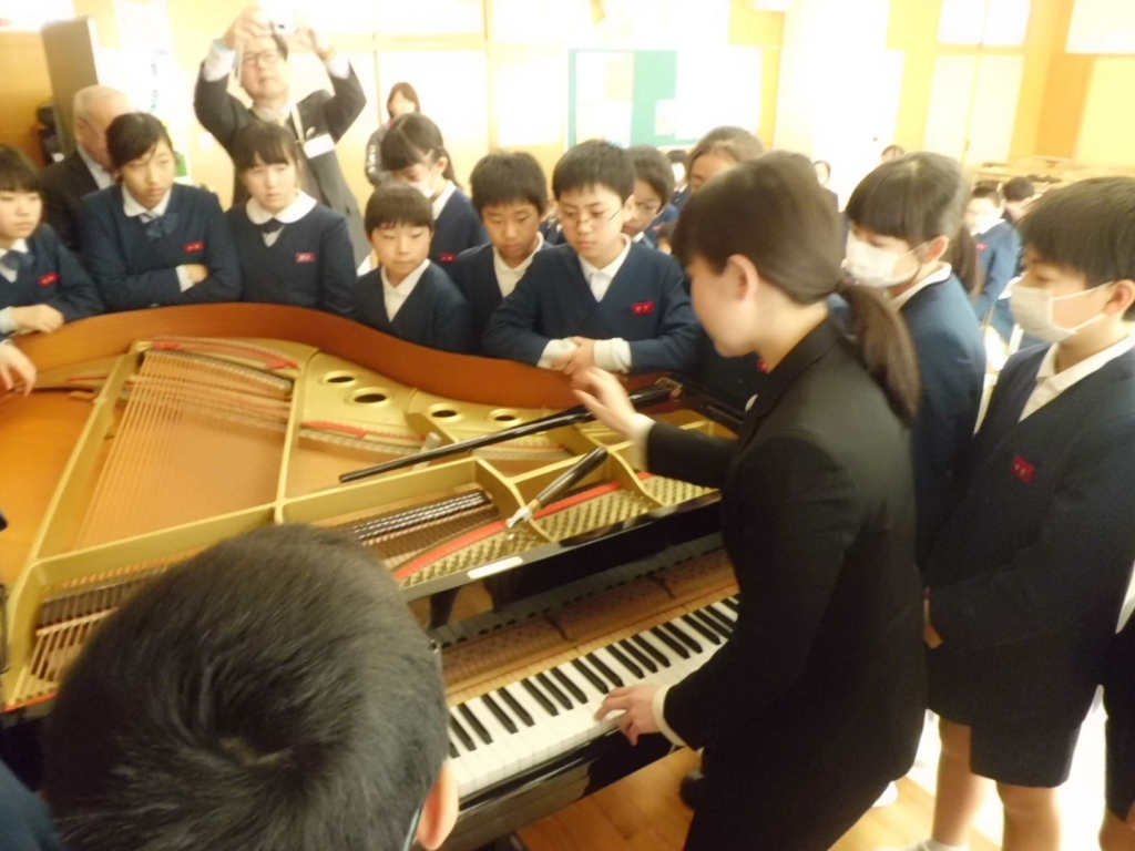 6年生 キャリア教育「調律師」 投稿日時 : 2019/01/25 agatae 1月25日(金)3,4限目に6年生がキャリア教育で調律師の仕事について学びました。子どもたちは、調律師の仕事内容について詳しく聞き、理解を深めていました。また、実際に調律の体験をさせていただきました。なかなか経験のできない貴重な体験をすることができ、子どもたちはとても嬉しそうでした。調律されたピアノでピアニストの生の演奏も聴き、美しい旋律に聴き入っていました。調律師の仕事の楽しさや面白さ、大変さを知る良い機会となりました。