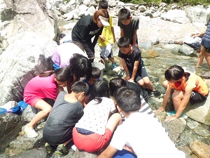 2日目はお天気に恵まれ,イワナつかみや川遊びなど川での活動を思いっきり楽しむことができました。英田小学校に与えられた範囲の中には,50匹のイワナが放たれましたが,子どもたちは52匹のイワナを捕まえました。前日の学校が取り残したイワナまでとってしまったようです!とったイワナは自分たちで調理しました。命をいただくということを学びながらのよい活動になりました。じんたろう焼きという特別な焼き方をしていただき,骨まできれいに食べていました。