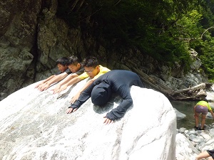 1日目はあいにくの雨で予定していた登山は中止になりましたが,恐竜パークラリーや追跡ハイクなど,別のメニューで「自分たちで行動し,みんなで協力できる楽しい合宿にしよう」のめあてに向かって活動できました。夜のミステリーゾーンという活動では,怖いやら楽しいやらで思いっきり体力を使いました。おかげで夜は,みんなぐっすりでした。