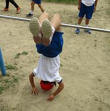 1年生は、体育で鉄棒をしています。カードの技がどんどんできるようになってきました。