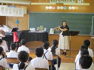 実は、ピアノで伴奏をしてくださっているのは先生の妹さんです。英田小の子どもたちのために、来てくださいました。そして、4年生とは、リコーダーとフルートとピアノで「小さな世界」のアンサンブルとなりました。