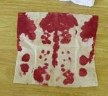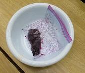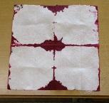 いろいろな色のアサガオを冷凍してためておいた色水に、折った紙を浸して開くと不思議な模様ができました。