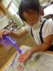 1年生。アサガオの花の色水を、紙に染めて遊びました。