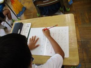 3年生から、横書きでの文章の書き方を練習します。項目を立てて原稿用紙に書くって意外と難しいのですが、先生のモデルを見てしっかり書いていました。
