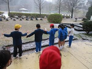 学校をまわっていると、2年生は、もう、あられに夢中‼ 外に出たくてたまらない様子でした。
