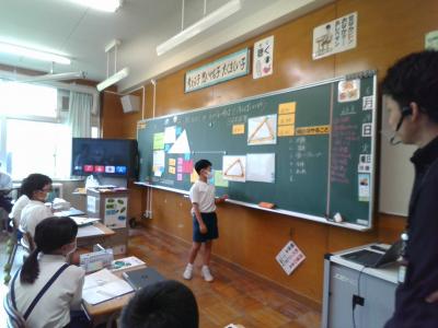 今日の5年生の算数の授業では、合同な三角形を描くための条件について考えました。大型モニターやタブレットを活用し、話し合いや発表を通して、自分の考えを出し合いました。どの子も意欲的に考え、問題に取り組む姿を見ることができました。