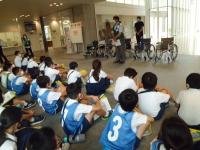 先日、4年生が休館中のシグナスの施設を使って、車いすを使ったバリアフリー体験をしました。ボランティアの方々の協力をいただき、車いすを使って実際にシグナスの中を移動してみました。