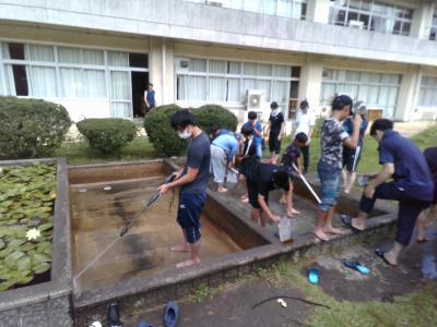 朝から職員総出で、倉庫の整理、池の清掃を行いました。