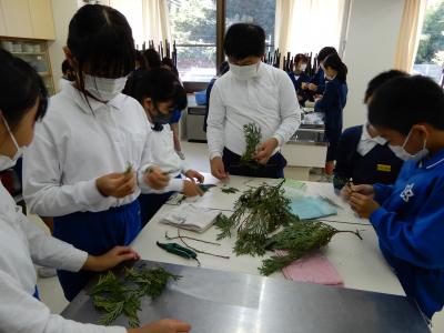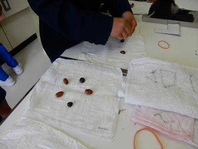 ハンカチでどんぐりやまつぼっくりをつつみ、輪ゴムでしばっていきます。それを煮汁に漬け込むと、いろいろな模様が出来上がります。調理室にはアテや桜の良い香りがただよい、子どもたちはそれぞれの作品作りに没頭していました。