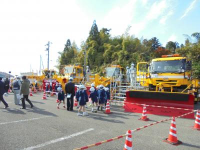 学校の駐車場に大きな重機が4台。これは県の土木事務所が除雪に使う実際の除雪車たちです。これから雪の季節を迎え、活躍するはたらく車なのですが、除雪をしているときは危なくて近寄ることはできません。