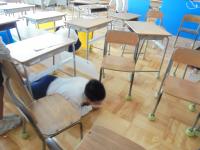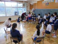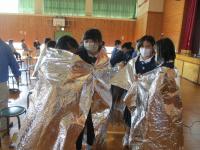 地震などの災害時,学校の体育館が避難所となることはよくあります。日本赤十字社の北村さんのお話を聞いたあと、小学校の体育館が避難場所になったことを想定し,避難している方々への声がけ体験をしました。また、フェイスシールド作りやレスキュー保温シート体験もしました。