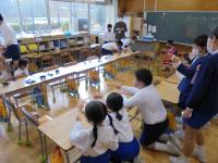 今日の2・3限、縦割り班でお店を開く「ふれあいチャレンジ」がありました。それぞれの班がゲームを準備してお店を開き、そこを子どもたちが周ります。