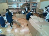 今日の2年の図工では,ダンボールを使って迷路作りをしました。机やいすなども使い,みんなで協力しながら作っていました。トンネルのようにしたり,お化けやしきのようにしたりとみんな楽しそうに取り組んでいました。