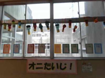 図書委員会ではこれまでも楽しい取組をしてきましたが、2月の取組も楽しそうです。「読書で鬼退治」です。各クラスの期間中の読書冊数が100冊を超えた場合、窓にぶら下がっている鬼を退治できるそうです。みんなでたくさん本を読んで、鬼をやっつけることができるといいですね。
